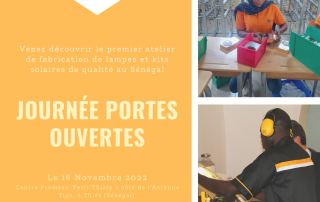 Venez découvrir le premier atelier de fabrication des lampes et kits solaires LAGAZEL au Sénégal ! A l'occasion de l’inauguration de la ligne de production sénégalaise, LAGAZEL et PROMESS organisent une Journée Portes Ouvertes le mercredi 16 novembre sur le site du Centre Promess, à Thiès. LAGAZEL est le premier fabricant de lampes et kits solaires de qualité en Afrique. [...]